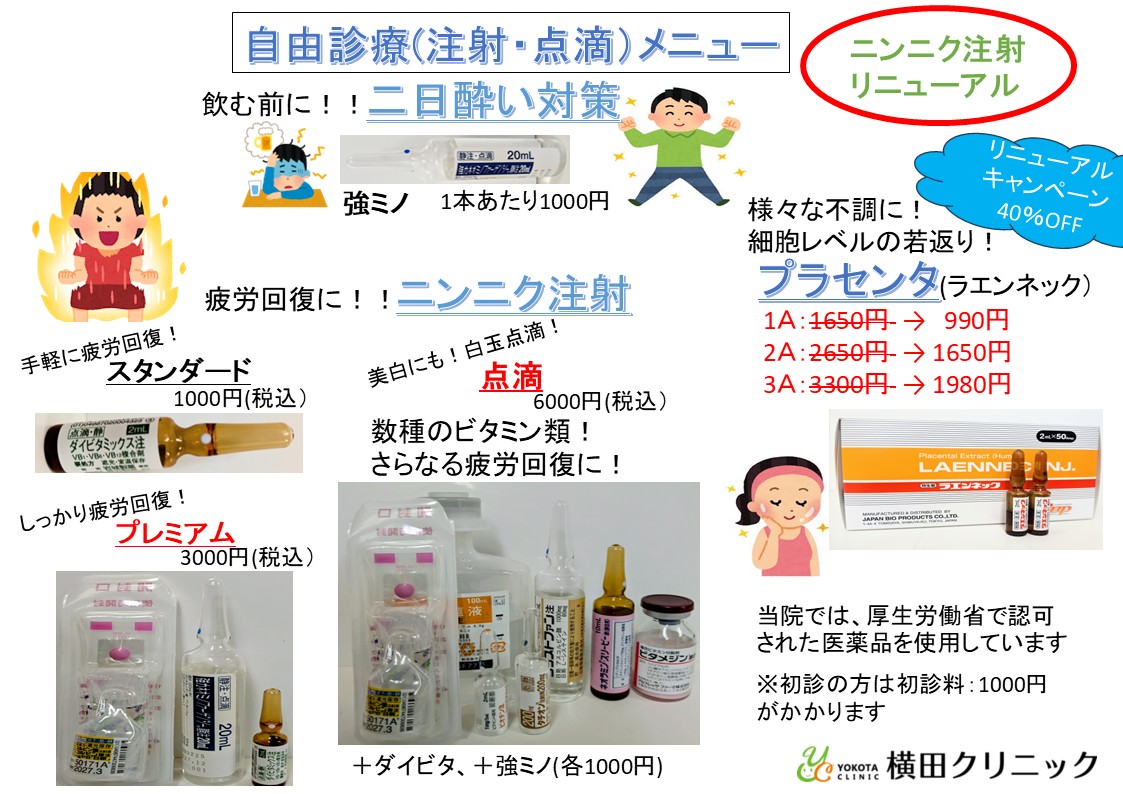 写真のニンニク注射、ビタミン(白玉)点滴の他、プラセンタ(ラエンネック)注射も行っています。